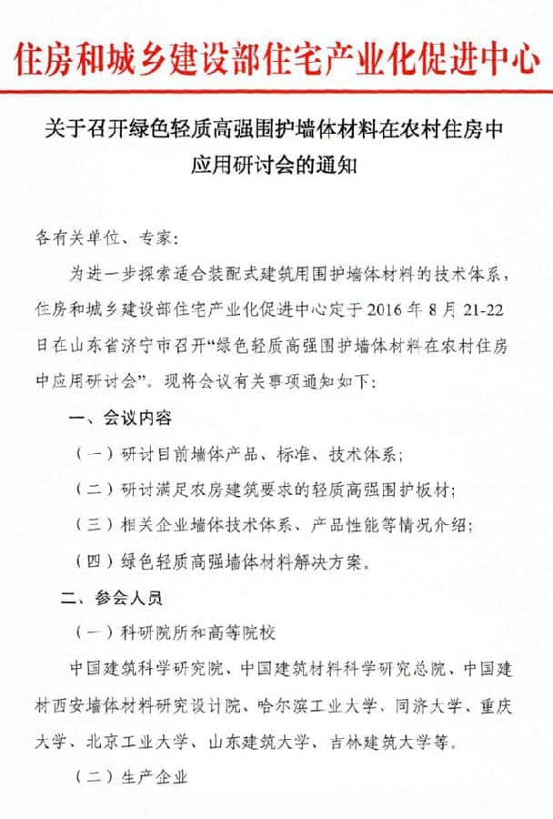 為進(jìn)一步探索適合裝配式建筑用圍護(hù)墻體材料的技術(shù)體系,住房和城鄉(xiāng)建設(shè)部住宅產(chǎn)業(yè)化促進(jìn)中心定于2016年8月21-22日在山東濟(jì)寧市兗州區(qū)召開“綠色輕質(zhì)高強(qiáng)圍護(hù)墻體材料在農(nóng)村住房中應(yīng)用研討會(huì)”。